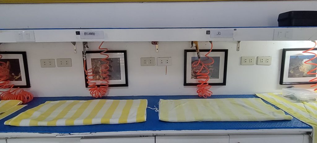 As it was raining last night, we brought our jackets up to the room to dry under the fan (everything else will dry quickly) together with our rash vests and leggings. All dry this morning. It doesn’t matter too much as we have 40kgs each weight allowance.