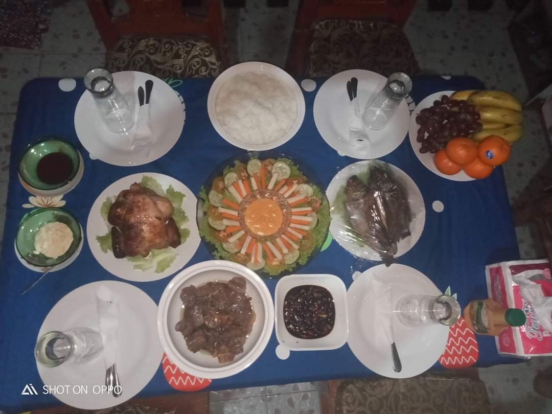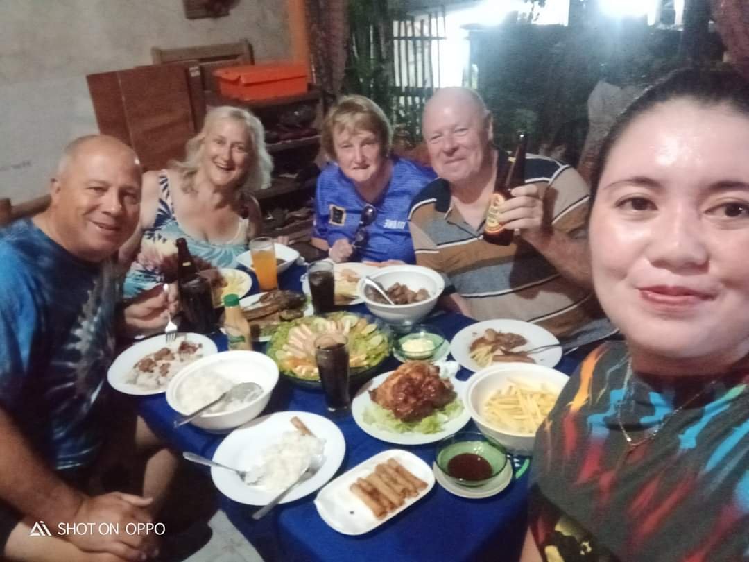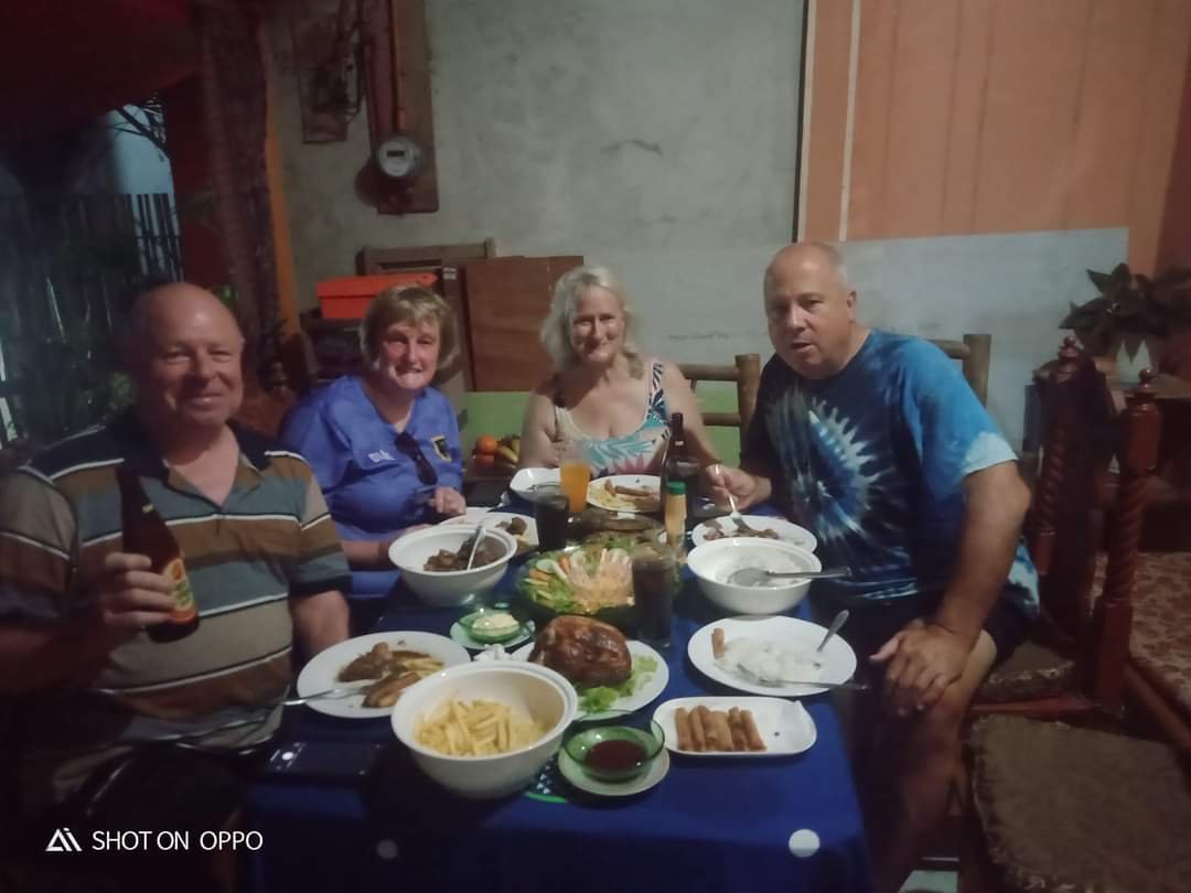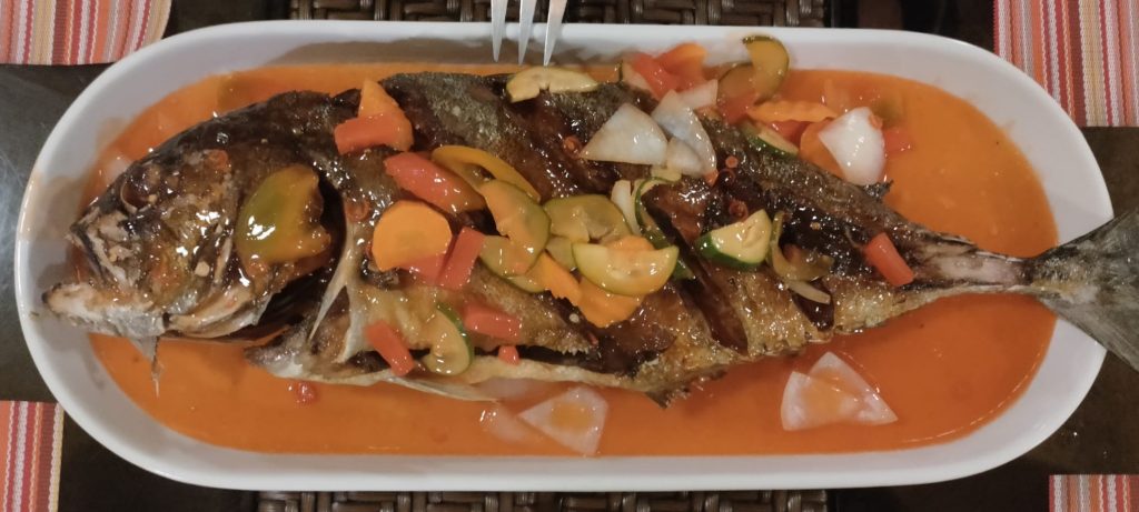 Dinner consists of Fried Lumpia followed by shrimp soup. The soup is actually a broth packed with large prawns and vegitables, yum.